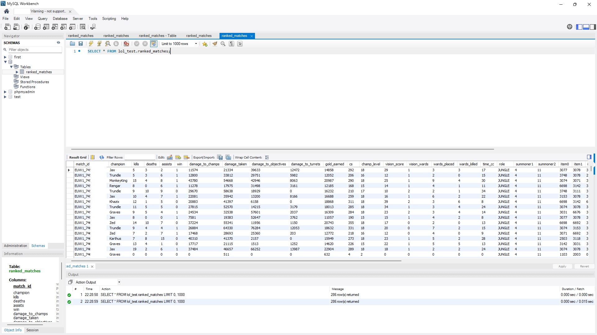 Note: Dataset exported from the Riot API and stored in MySQL; sample rows are shown in the "Sample Data Table" screenshots above.