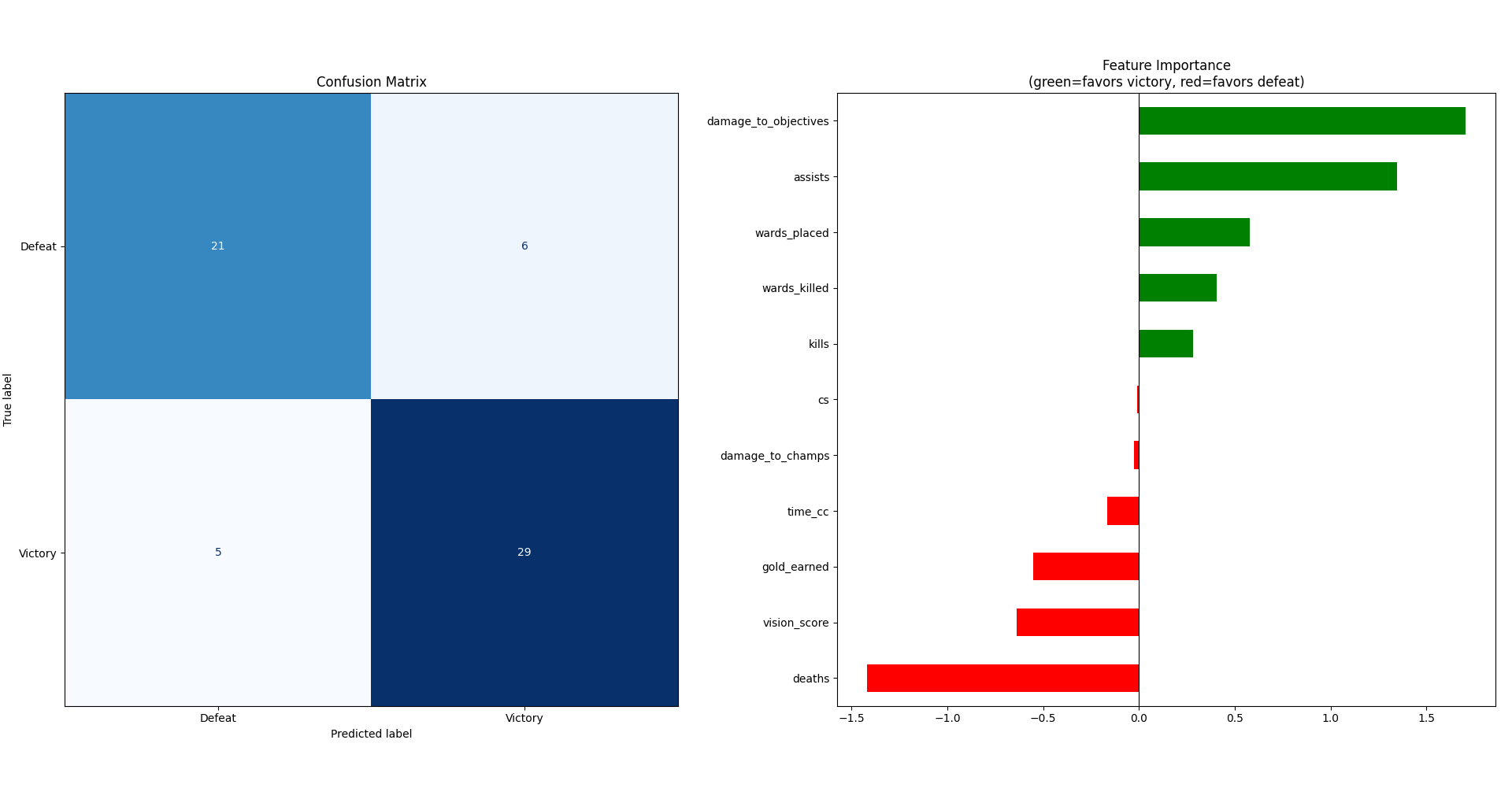 The bar chart shows each feature's coefficient in the model (green = favors victory, red = favors defeat).